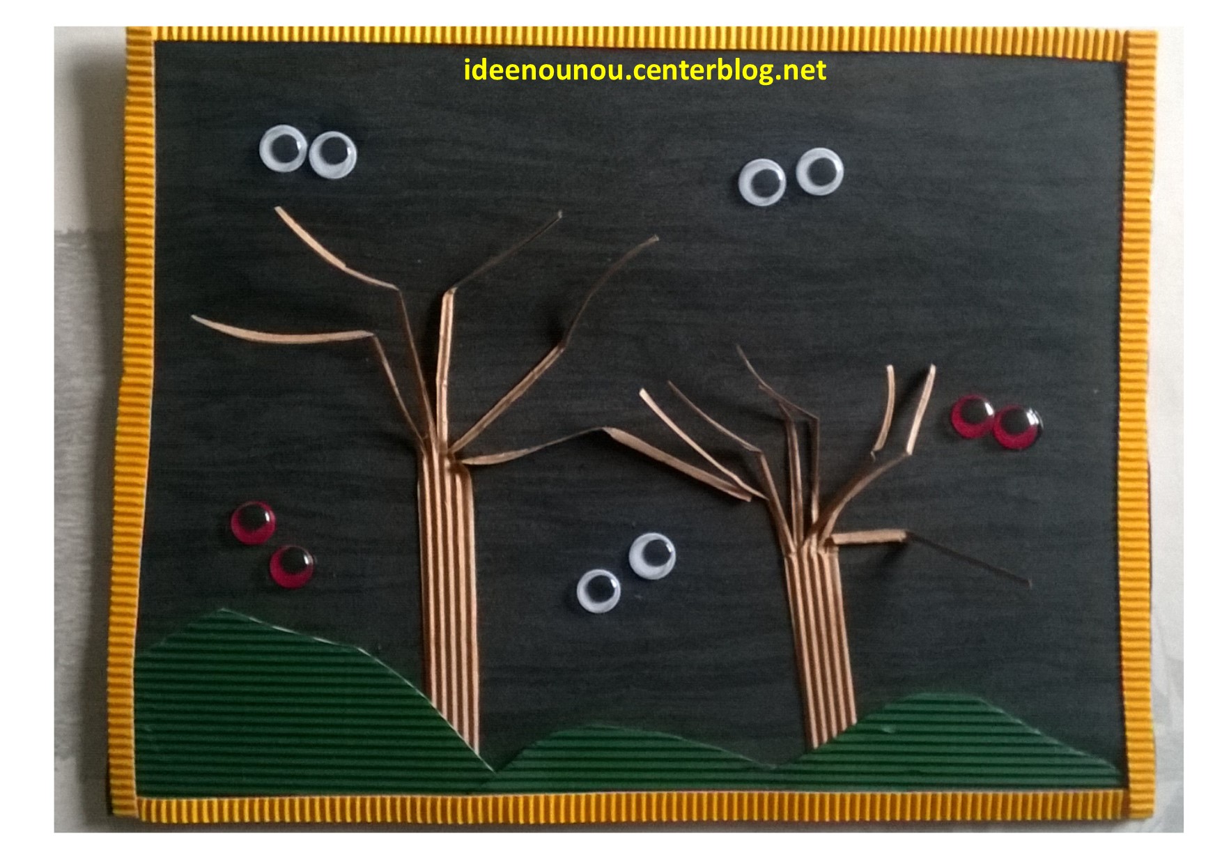 Un décor tout simple en carton ondulé sur papier peint. Ne pas coller les branches des arbres cela fait un effet 3D. Rajouter des yeux ! BOUUUUHHHH