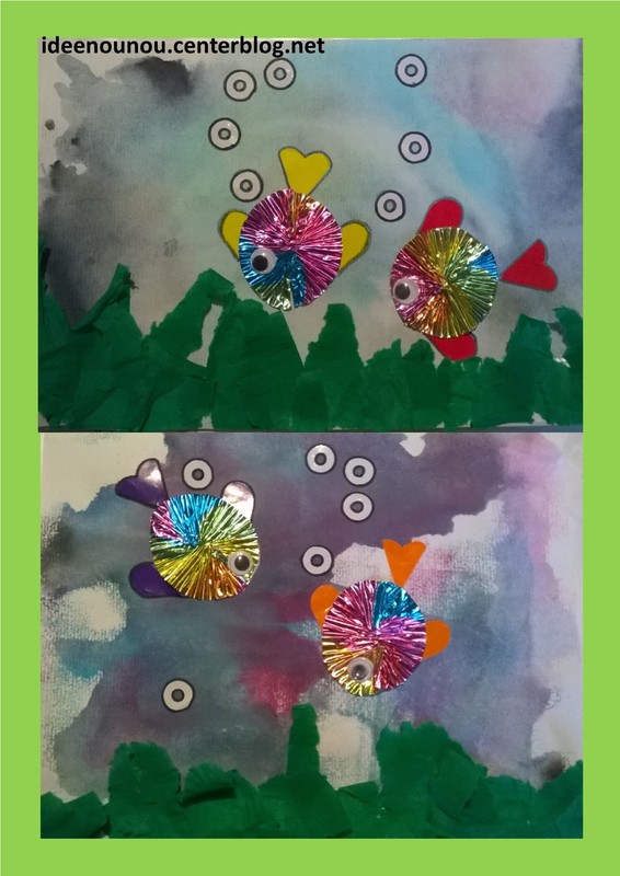 Un fond peintures au lait, des algues en papier crépon, des oeillets de classeur pour les bulles et des poissons avec des bouts de guirlande arc en ciel. ça brille, ça brille !